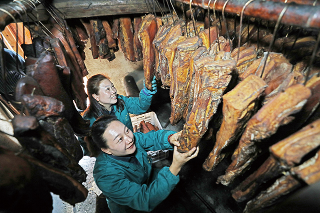 朱靜堂那頭300多斤的肥豬,也將在工人的手下變成美味的臘制品。那塊寄往德國(guó)的臘肉,正來源于此。