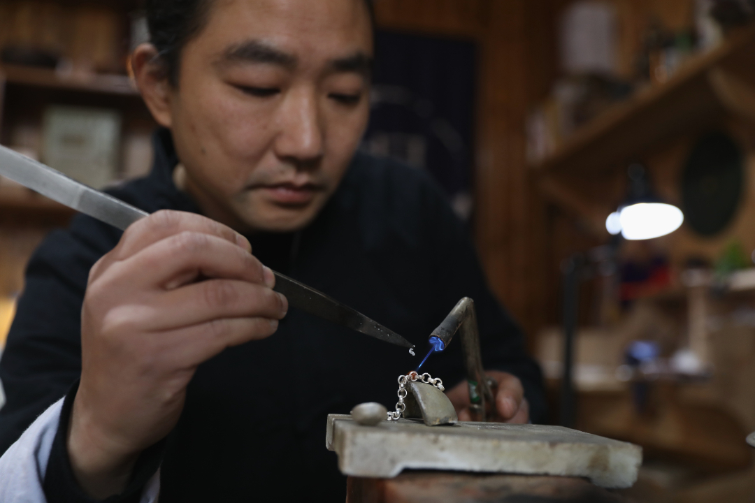 今年46歲的庹俊鹖,出生在彭水的一個苗族銀匠家庭。2011年,在父輩的鼓勵下,他承辦銀飾作坊,利用祖?zhèn)骷妓囍谱髅缂沂罪?、生活用具,讓根植于彭水苗鄉(xiāng)的傳統(tǒng)手工藝品走向市場。他是重慶市非物質(zhì)文化遺產(chǎn)“苗族銀飾鍛制技藝項目”的唯一傳承人。